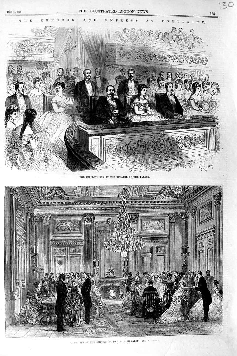 1868 IMP?RATRICE IMP?RIALE DU PALAIS COMPIEGNE DE TH??TRE DE CADRE Full page from the Illustrated London News, an illustrated weekly newspaper weeks date as shown on top of page, the size of each page is approximately 16 x 11 inches (410x280). All are genuine antique prints and not modern copies, the Illustrated London News is an illustrated magazine which was first printed in 1842 and is the finest pictorial example of a historic social record of British and world events up to the present day. The ILN is known for its coverage of the following subjects the wars, ships, boats, guns, sailing, portraits, fine art, old and antique prints, wood cut, wood engravings, early photographs, Victorian life, Victorian culture, kings, queens, royalty, travels, adventures, natural history, birds, fish, mammals, fishing, hunting, shooting, fox hunting, sports including tennis, cricket, football, horse racing, politics and many more items of interest founded by Herbert Ingram may 14th 1842.