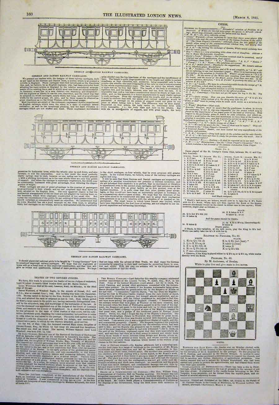 Copie Danoise Allemande de Chariots Ferroviaires de Solutions d'?checs? Old Antique Historical Victorian Prints Maps and Historic Fine Art ----------. Chess Solutions Railway Carriages German Danish Print Page From An Issue 1845 . The Illustrated London News . These Wood Engravings From Sketches, Or Early Photographs Would Make An Ideal Gift For Christmas Or Birthday . The Actual Date Is Printed On Each Page . This Engraving Is Over 150 Years Old. And Is Not A Modern Copy. These Images Are Scanned At Low Resolution For Quick Uploading And Are Much Better Than The Scanned Image.. Size Of Print Is Approx ( injcluding margins as shown ) 14" X 9.1/2" If It Is Shown As Whole Page, Or Prorata.. Approx ( injcluding margins as shown ). Page Size = 16" High X 11" Wide. Ready To Matt And Frame. These Old Prints Really Look Great With Matt And Framed. . Note This Print Is From A Periodical And Has Printing On Reverse.