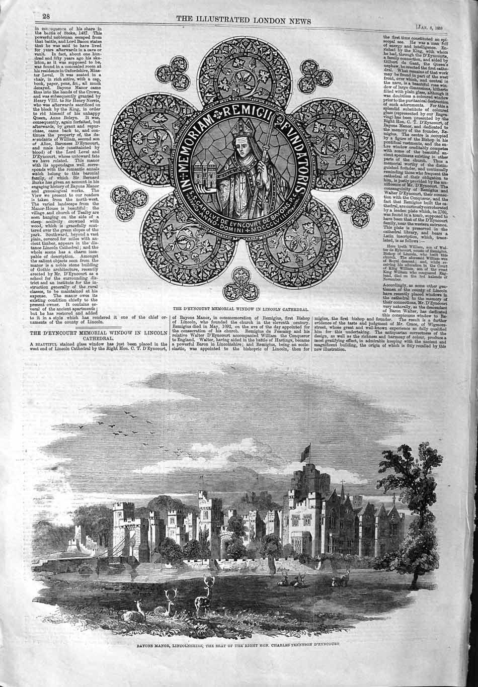 MANOIR COMM?MORATIF DE 1859 DE D'EYNCOURT DE FEN?TRE RAYONNES DE LINCOLN Full page from the Illustrated London News dated 1859, an illustrated weekly newspaper weeks date as shown on top of page, the size of each page is approx ( including margins as shown )imately 11 x 16 inches (280x410). All are genuine antique prints and not modern copies, the Illustrated London News is an illustrated magazine which was first printed in 1842 and is the finest pictorial example of a historic social record of British and world events up to the present day. The ILN is known for its coverage of the following subjects the wars, ships, boats, guns, sailing, portraits, fine art, old and antique prints, wood cut, wood engravings, early photographs, Victorian life, Victorian culture, kings, queens, royalty, travels, adventures, natural history, birds, fish, mammals, fishing, hunting, shooting, fox hunting, sports including tennis, cricket, football, horse racing, politics and many more items of interest founded by Herbert Ingram may 14th 1842.