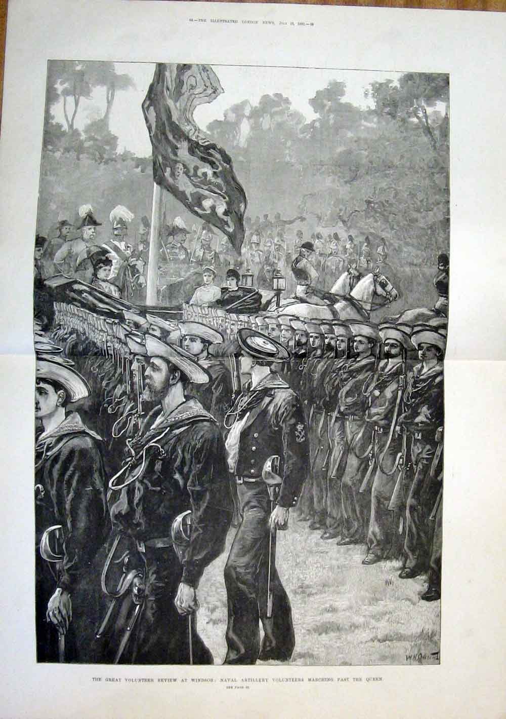 Reine Navale 1881 d'Artillerie de Windsor de R?vision Volontaire? Old Antique Historical Victorian Prints Maps and Historic Fine Art ----------. Volunteer Review Windsor Naval Artillery Queen 1881 Rare Double Page From An Issue Of 1881 . Wood Engravings And Early Photographs From . The Illustrated London News . Would Make An Ideal Gift . The Actual Date Is Printed On Each Page . This Print Is Over 120 Years Old. And Is Not A Modern Copy. There Is A Fold Which Sometimes Shows As A Shadow On The Image, This Will Not Show When Framed. Check The Image For Details Some Double Spreads Have Binding Holes So Kindly Check Scan .. Size Of Print Is Approx ( injcluding margins as shown ) ' 19" X 12" (480X300) . Approx ( injcluding margins as shown ). Page Size = 22" X 16" (560X410) . Ready To Matt And Frame. These Old Prints Really Look Great With Matt And Framed. . Note This Print Is From A Periodical And Has Printing On Reverse.. Scanned At A Low Resolution For Quick Uploading So The Actual Picture Is Better Than The Scanned Image.